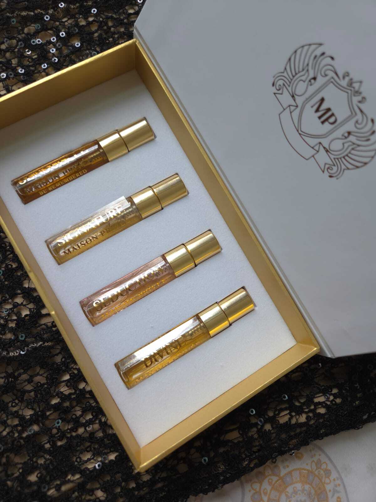 The Maison Privée Discovery Set is a curated collection of our four signature fragrances—Divine, Signature, Sensuelle, and Seduction—presented in elegant, pocket-sized bottles. Designed for exploration and versatility, it invites you to experience the full universe of Maison Privée in one refined set.